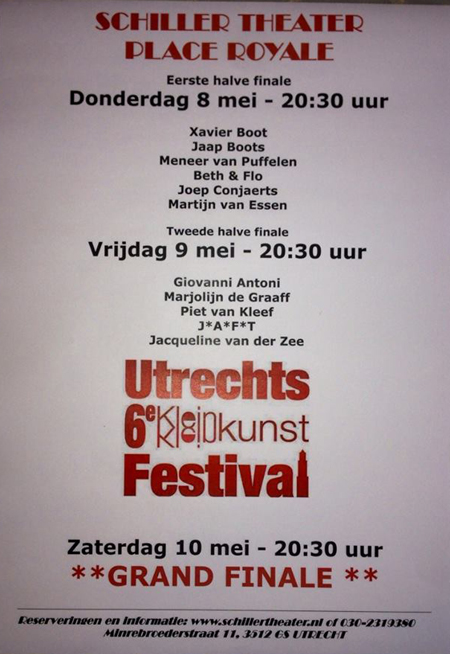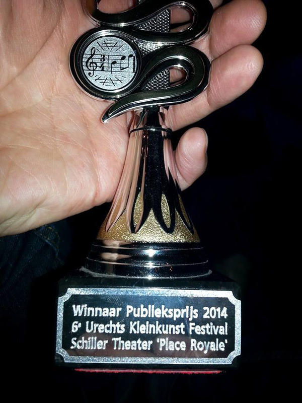 Persbericht *J*A*F*T* *J*A*F*T* wint publieksprijs kleinkunst festival De Nieuwegeinse formatie *J*A*F*T* heeft afgelopen zaterdag de publieksprijs van het 6e Utrechts Kleinkunst Festival gewonnen. Van de 37 inschrijvingen en 11 finalisten waren zij bij het publiek de favoriet. De theatrale, muzikale poëzie die zij ten gehore hebben gebracht heeft duidelijk weten te boeien. Het festival werd gehouden in het pittoreske Schiller Theater Place Royale in hartje Utrecht. De juryprijs ging naar Marjolein de Graaff en de aanmoedigingsprijs naar Giovanni Antoni. Later dit jaar zal *J*A*F*T* terugkeren in het Schiller Theater Place Royale met hun voorstelling “als JIJ er maar bent!” .